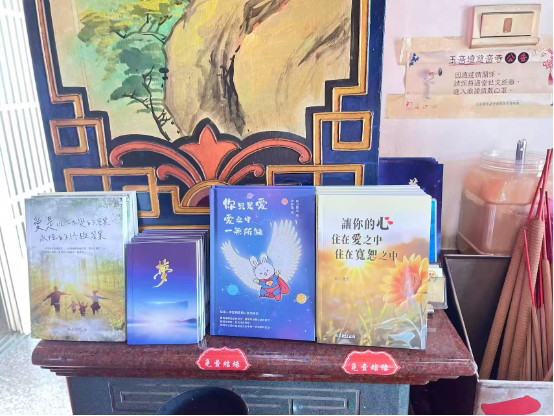 其他场景的弘法就很随缘了,打车的时候可以送法宝给出租车司机,去餐馆用餐,商店买东西时,也可以随缘赠送给店里的营业员。台南人普遍算是谦和礼貌的,并且保留着良好的书本阅读习惯,我们在街上赠送的书籍,接受的人一般都会翻开仔细阅读片刻。在一些中高端的咖啡店和民宿休息区,也都有阅读书架,这类店铺比较欢迎我们赠送的书籍,允许我们放在他们的书架上供客人阅读。我们会把《爱》《让》《梦》英文版和结缘版,送进这些饮品店和民宿。现在很多年轻人流行迷茫,对前途和人生迷茫,和我年轻时候很像,这类人群如果出来旅游散心,也许会有缘看到我们的书籍。