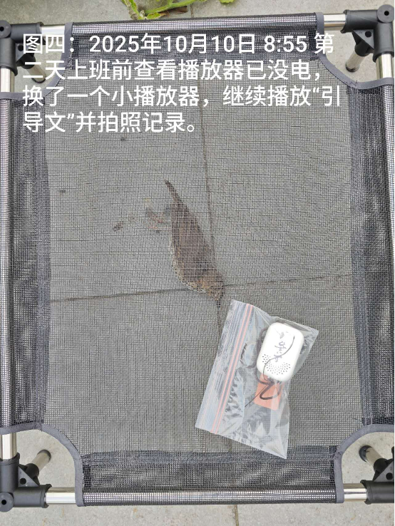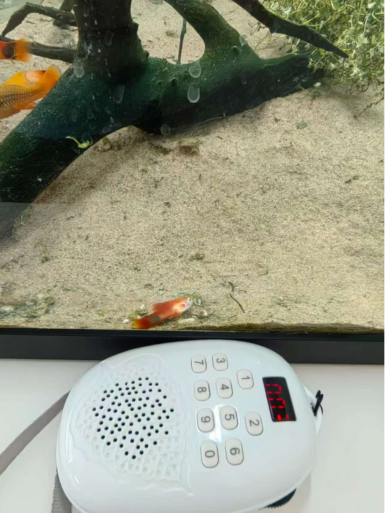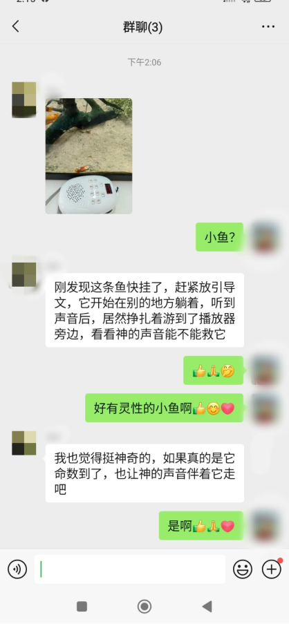 另外,之前八月份的一个周末,我的同事兼同修也见证过她家小鱼在生命最后阶段,挣扎地游到放着《引导文》的播放器旁边。她在我们同事三人群里分享过。附上当时的聊天记录截屏(图八)和原图(图九)。