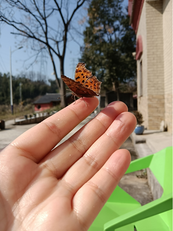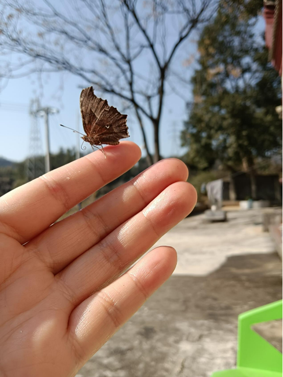 于是,我决定用手机给它拍个照(不影响手机里持续地播放讲法)。这次,当我把左手伸向它时,它又像昨天一样,一动不动,而后直接爬上了指尖,我右手拿手机拍下了与它跨越无数时光在圣光宗中相遇的合影。手机里依旧在讲法,近在方寸,此时它安闲地在我的手指上轻盈地走来走去。迎风举高它,以蓝天绿树为背景摆拍,它依旧安然。