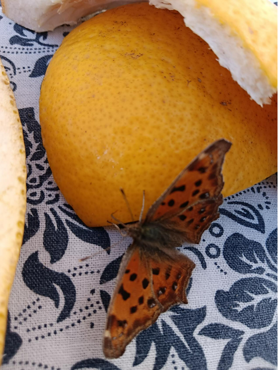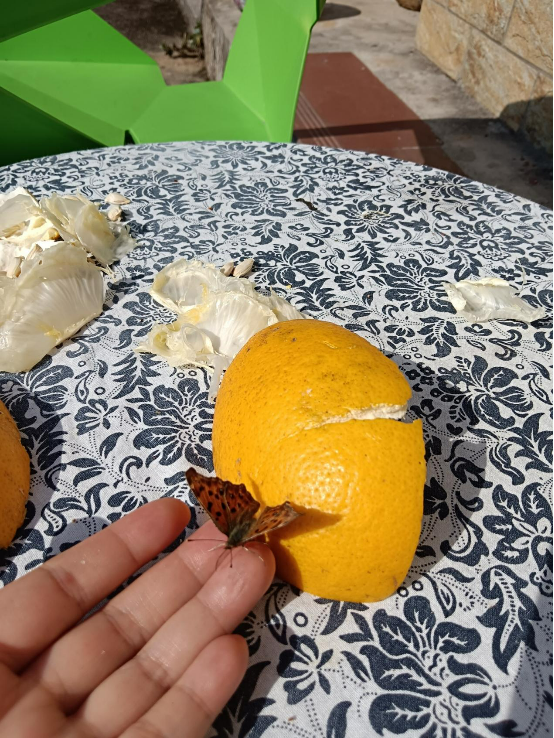很神奇,今天中午在院子里喝茶听法时,来了一只蝴蝶,停在了桌子上的柚子皮上。