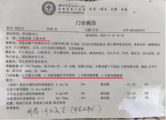 右眼白内障、右眼角膜斑翳;双眼角膜化学性烧伤;左眼角膜瘢痕,左眼失明。